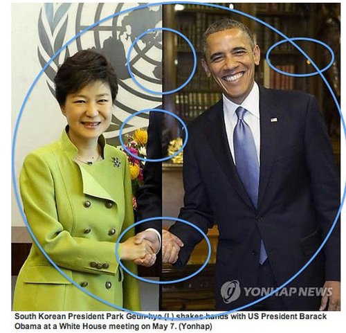 美媒調(diào)侃韓聯(lián)社合成樸槿惠(左)與奧巴馬握手照。(網(wǎng)頁截圖)韓國總統(tǒng)樸槿惠與聯(lián)合國秘書長潘基文握手照(資料圖)近一個多月以來,朝鮮半島出現(xiàn)緊張對峙局面,韓國總統(tǒng)樸...">