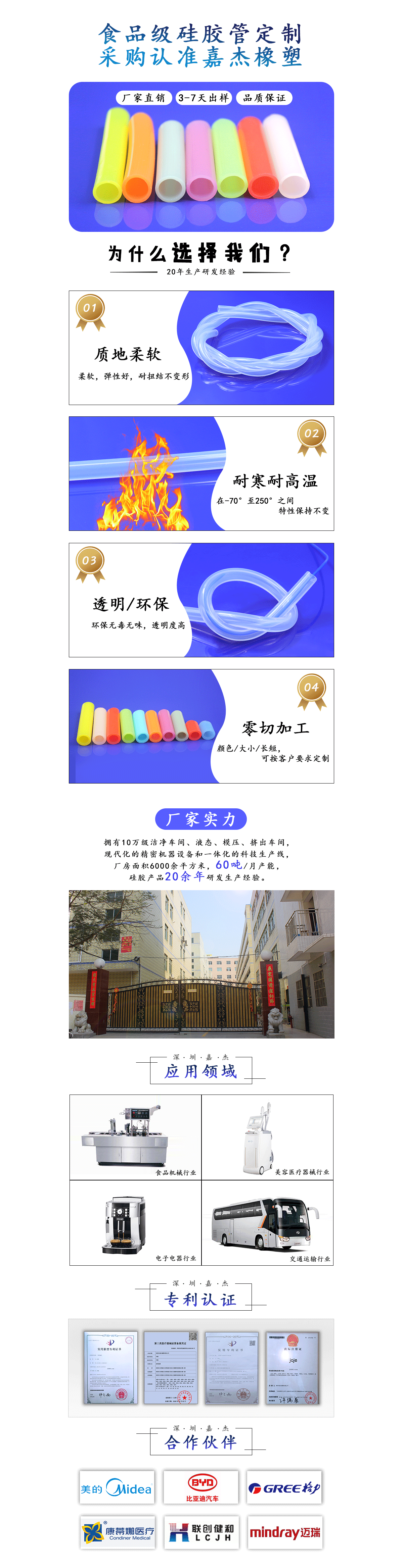 可用做水煙壺硅膠管,是進口食品級硅膠管,專業(yè)認證!綠色環(huán)保硅膠制品 1.進口食品級硅膠管,顏色多樣,透明,紅,橙,黃,綠,青,藍,紫等可按客戶色版定制; 2.耐溫范圍:在-50℃至200℃,尺寸公差:常規(guī)尺寸+/-0.1mm,部分尺寸公差可做到+/-0.05mm,硬度范圍:進口材料30A-70A; 3.食品級硅膠管表面可按照客戶需求絲印字體、LOGO; 4.硅膠管有美國食品級FDA檢測報告,德國LFGB檢測報告 食品級硅膠管用途: 食品級硅膠管適用于阿拉伯水煙搶,食品加工、配套電器、電子、家具設備、玩具、五金、醫(yī)療設備、體育用品、